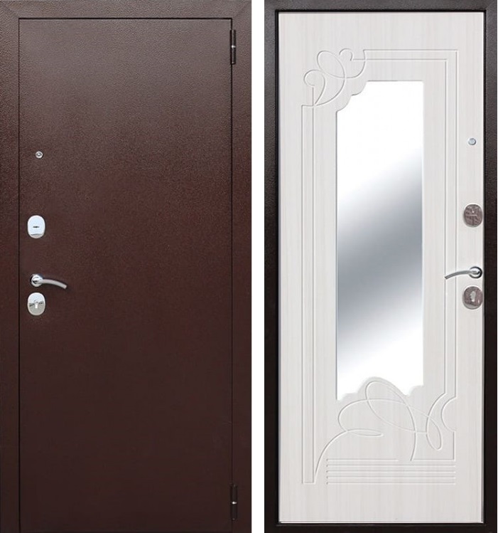 Дверь металлическая входная. Прокатный короб из холоднокатанной стали 1,2 мм. Толщина металла полотна 1,2 мм. Все конструктивные элементы двери изготовлены на лазерной установке с источником IPG. Толщина полотна 70 мм. Наполнение полотна: минеральная вата Tisma Aquastatic/Ursa Geo 44. Короб закрытый, также утеплен минеральной ватой. Основной замок цилиндровый Гардиан 3211 (4 класс защиты по ГОСТ 5089-2011), дополнительный замок сувальдный Гардиан 3001 (3 класс защиты по ГОСТ 5089-2011). Для регулировки притвора двери на коробе есть специальный язычок, при установке его можно подтачивать. Цилиндровый механизм (хром) ключ+вертушок. Накладки овальные. Ручка на круглом основании модель 26. 3 противосъемных ригеля. 2 контура уплотнения. Уплотнитель изготавливается из резиновых смесей на основе EPDM каучуков. Внутренняя панель фрезерованная МДФ толщиной 12 мм., с зеркалом, покрытие экошпон, цвет дуб филадельфия.