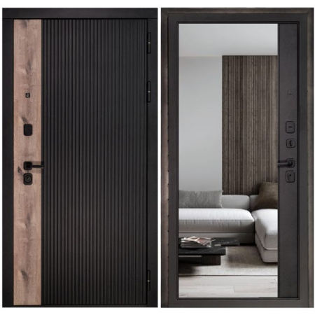 Дверь металлическая входная. Прокатный короб из холоднокатанной стали 1,5 мм. Толщина металла полотна 1,5 мм. Все конструктивные элементы двери изготовлены на лазерной установке с источником IPG. Толщина полотна 106 мм. Наполнение полотна: минеральная вата Tisma Aquastatic/Ursa Geo 44 + базальтовая плита Rockwool/Euroizol. Короб закрытый, также утеплен базальтовой плитой. Основной замок цилиндровый Гардиан 3211 (4 класс защиты по ГОСТ 5089-2011), дополнительный замок сувальдный Гардиан 3001 (3 класс защиты по ГОСТ 5089-2011). Для регулировки притвора двери на коробе установлен эксцентрик. Цилиндровый механизм ключ-шток-вертушок. Накладки квадратные. Независимая ночная задвижка. Ручка на квадратном основании основании модель Torr. 3 противосъемных ригеля. 3 контура уплотнения. Уплотнитель изготавливается из резиновых смесей на основе EPDM каучуков. Внутренняя панель фрезерованная МДФ толщиной 16 мм., с зеркалом, покрытие экошпон, цвет муар чёрный. Внешняя отделка фрезерованная двухцветная панель МДФ 10 мм., покрытие экошпон, цвет дуб пацифик/муар чёрный.