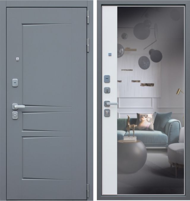 Дверь металлическая входная. Прокатный короб из холоднокатанной стали 1,5 мм. Толщина металла полотна 1,5 мм. Все конструктивные элементы двери изготовлены на лазерной установке с источником IPG. Толщина полотна 106 мм. Наполнение полотна: минеральная вата Tisma Aquastatic/Ursa Geo 44 + базальтовая плита Rockwool/Euroizol. Короб закрытый, также утеплен базальтовой плитой. Основной замок цилиндровый Гардиан 3211 (4 класс защиты по ГОСТ 5089-2011), дополнительный замок сувальдный Гардиан 3001 (3 класс защиты по ГОСТ 5089-2011). Для регулировки притвора двери на коробе установлен эксцентрик. Цилиндровый механизм ключ-шток-вертушок. Накладки квадратные. Независимая ночная задвижка. Ручка на квадратном основании модель Torr. 3 противосъемных ригеля. 3 контура уплотнения. Уплотнитель изготавливается из резиновых смесей на основе EPDM каучуков. Внутренняя панель фрезерованная МДФ толщиной 16 мм., с зеркалом, покрытие экошпон, цвет муар белый. Внешняя отделка фрезерованная панель МДФ 10 мм., покрытие экошпон, цвет серый.