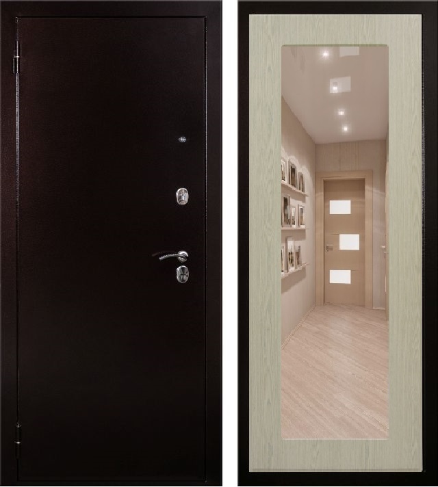 Дверь металлическая входная. Прокатный короб из холоднокатанной стали 1,5 мм. Толщина металла полотна 1,5 мм. Все конструктивные элементы двери изготовлены на лазерной установке с источником IPG. Толщина полотна 91 мм. Наполнение полотна: минеральная вата Tisma Aquastatic/Ursa Geo 44. Короб закрытый, также утеплен базальтовой плитой. Основной замок сувальдный Гардиан 30.11. Дополнительный замок цилиндровый Гардиан 32.01. Для регулировки притвора двери на коробе установлен эксцентрик. Цилиндровый механизм (хром) ключ+вертушок. Накладки овальные. Ручка на круглом основании модель 26. 3 противосъемных ригеля. 3 контура уплотнения. Уплотнитель изготавливается из резиновых смесей на основе EPDM каучуков. Внутренняя панель фрезерованная МДФ толщиной 12 мм., с зеркалом, покрытие экошпон, цвет экодуб.