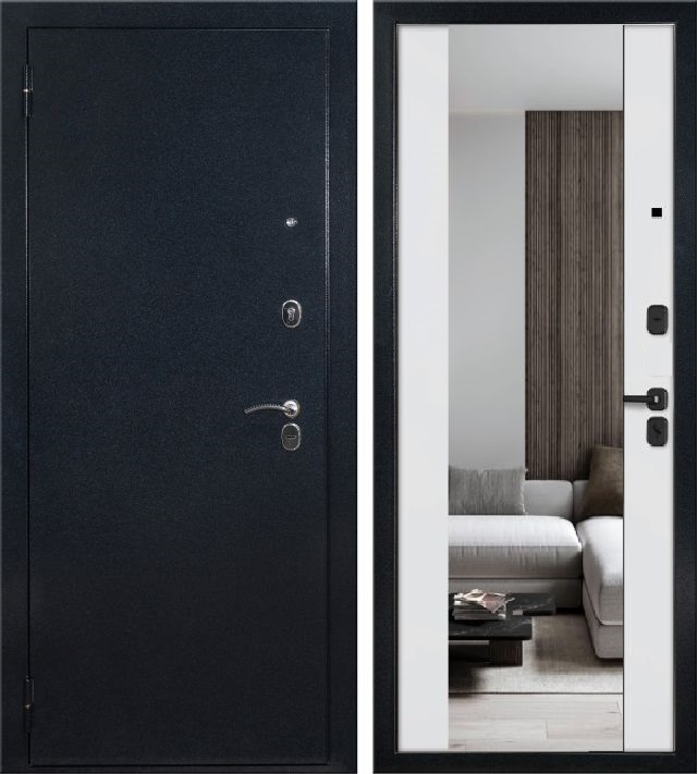 Дверь металлическая входная. Прокатный короб из холоднокатанной стали 1,5 мм. Толщина металла полотна 1,5 мм. Все конструктивные элементы двери изготовлены на лазерной установке с источником IPG. Толщина полотна 96 мм. Наполнение полотна: минеральная вата Tisma Aquastatic/Ursa Geo 44. Короб закрытый, также утеплен базальтовой плитой. Основной замок сувальдный Гардиан 30.11. Дополнительный замок цилиндровый Гардиан 32.01. Для регулировки притвора двери на коробе установлен эксцентрик. Цилиндровый механизм (хром) ключ+вертушок. Накладки квадратные. Ручка на квадратном основании модель Torr. 3 противосъемных ригеля. 3 контура уплотнения. Уплотнитель изготавливается из резиновых смесей на основе EPDM каучуков. Внутренняя панель фрезерованная МДФ толщиной 16 мм., с зеркалом, покрытие экошпон, цвет муар белый.