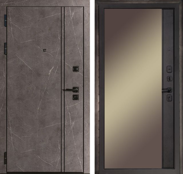 Дверь металлическая входная. Прокатный короб из холоднокатанной стали 1,5 мм. Толщина металла полотна 1,5 мм. Все конструктивные элементы двери изготовлены на лазерной установке с источником IPG. Толщина полотна 106 мм. Наполнение полотна: минеральная вата Tisma Aquastatic/Ursa Geo 44 + базальтовая плита Rockwool/Euroizol. Короб закрытый, также утеплен базальтовой плитой. Основной замок цилиндровый Гардиан 3211 (4 класс защиты по ГОСТ 5089-2011), дополнительный замок сувальдный Гардиан 3001 (3 класс защиты по ГОСТ 5089-2011). Для регулировки притвора двери на коробе установлен эксцентрик. Цилиндровый механизм ключ-шток-вертушок. Накладки квадратные. Независимая ночная задвижка. Ручка на квадратном основании основании модель Torr. 3 противосъемных ригеля. 3 контура уплотнения. Уплотнитель изготавливается из резиновых смесей на основе EPDM каучуков. Внутренняя панель фрезерованная МДФ толщиной 16 мм., с зеркалом, покрытие экошпон, цвет муар чёрный. Внешняя отделка фрезерованная панель МДФ 10 мм., с вставкой из чёрного молдинга, покрытие экошпон, цвет мрамор.