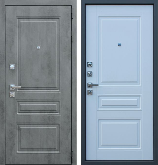 Дверь металлическая входная. Прокатный короб из холоднокатанной стали 1,5 мм. Толщина металла полотна 1,5 мм. Все конструктивные элементы двери изготовлены на лазерной установке с источником IPG. Толщина полотна 106 мм. Наполнение полотна: минеральная вата Tisma Aquastatic/Ursa Geo 44 + базальтовая плита Rockwool/Euroizol. Короб закрытый, также утеплен базальтовой плитой. Основной замок цилиндровый Гардиан 3211 (4 класс защиты по ГОСТ 5089-2011), дополнительный замок сувальдный Гардиан 3001 (3 класс защиты по ГОСТ 5089-2011). Для регулировки притвора двери на коробе установлен эксцентрик. Цилиндровый механизм ключ-шток-вертушок. Накладки квадратные. Независимая ночная задвижка. Ручка на квадратном основании основании модель Torr. 3 противосъемных ригеля. 3 контура уплотнения. Уплотнитель изготавливается из резиновых смесей на основе EPDM каучуков. Внутренняя панель фрезерованная МДФ толщиной 10 мм., покрытие экошпон, цвет бетон тёмный. Внешняя отделка фрезерованная панель МДФ 10 мм., покрытие экошпон, цвет муар белый.