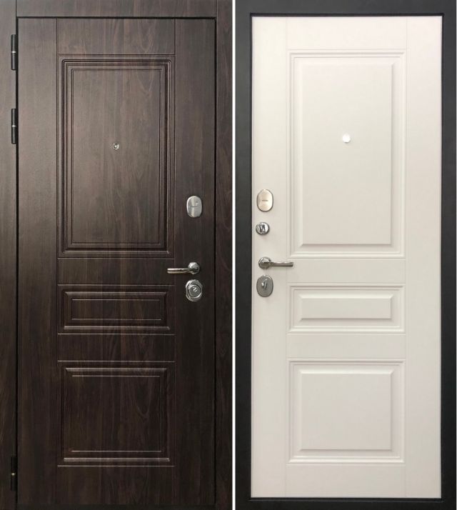 Дверь металлическая входная. Прокатный короб из холоднокатанной стали 1,5 мм. Толщина металла полотна 1,5 мм. Все конструктивные элементы двери изготовлены на лазерной установке с источником IPG. Толщина полотна 101 мм. Наполнение полотна: минеральная вата Tisma Aquastatic + базальтовая плита Euroizol Euro Eco 30. Короб закрытый, также утеплен базальтовой плитой. Основной замок цилиндровый Гардиан 3211 (4 класс защиты по ГОСТ 5089-2011), дополнительный замок сувальдный Гардиан 3001 (3 класс защиты по ГОСТ 5089-2011). Для регулировки притвора двери на коробе установлен эксцентрик. Цилиндровый механизм Avers (хром) ключ+вертушок. Фурнитура овальная хром (Fuaro). 3 противосъемных ригеля. 3 контура уплотнения. Уплотнитель изготавливается из резиновых смесей на основе EPDM каучуков. Наружная отделка: фрезерованная МДФ панель 10 мм., покрытие экошпон, цвет орех тёмный (TF 21 IE-3-94). Внутренняя отделка: фрезерованная МДФ панель 10 мм., покрытие экошпон, цвет муар белый.