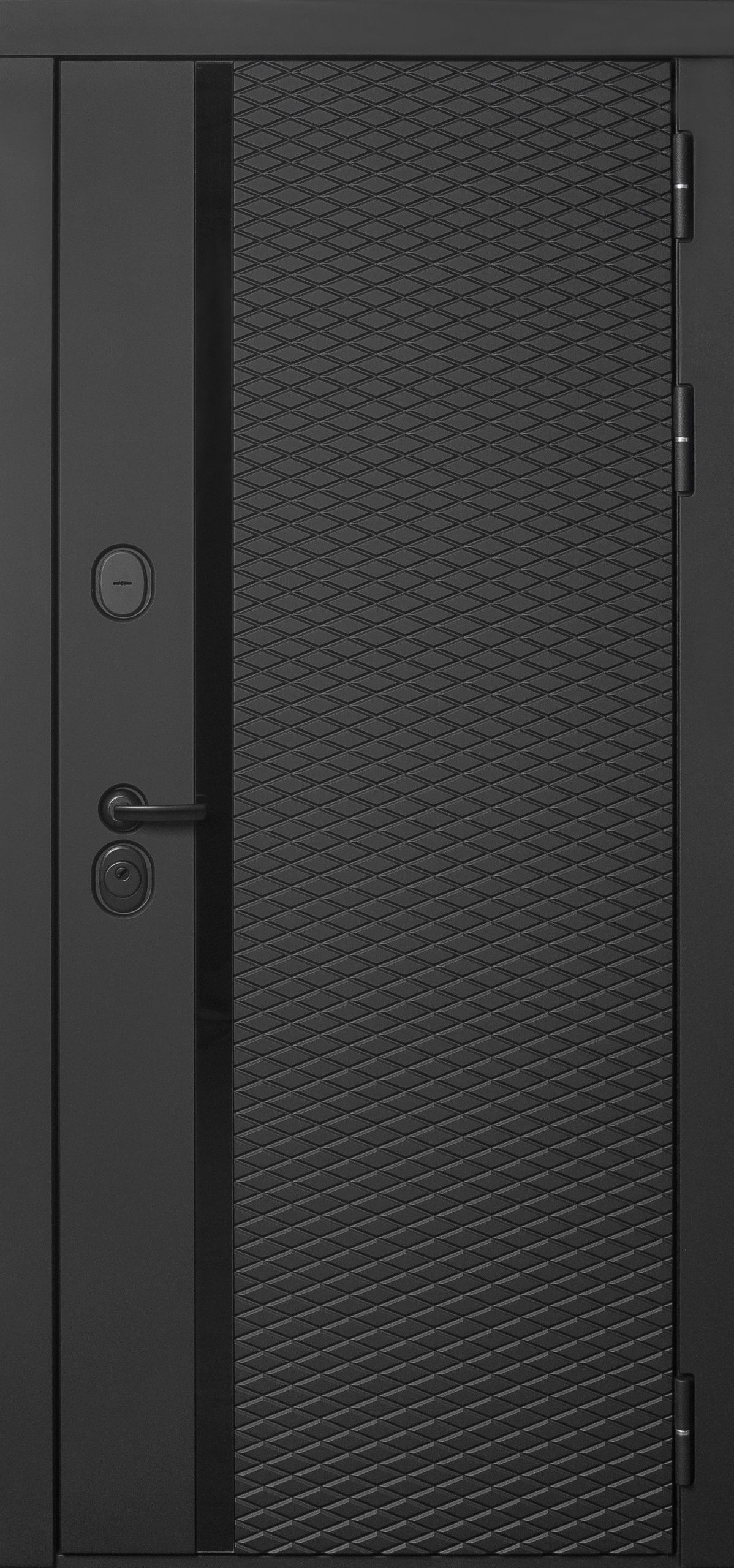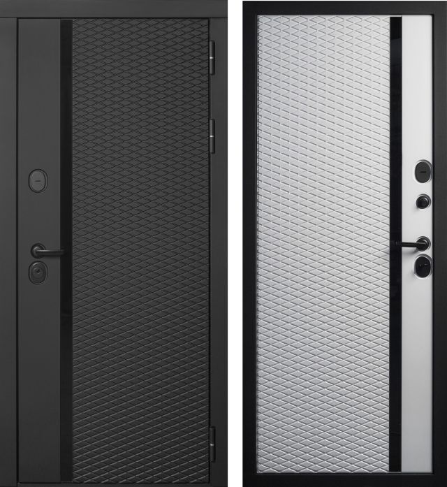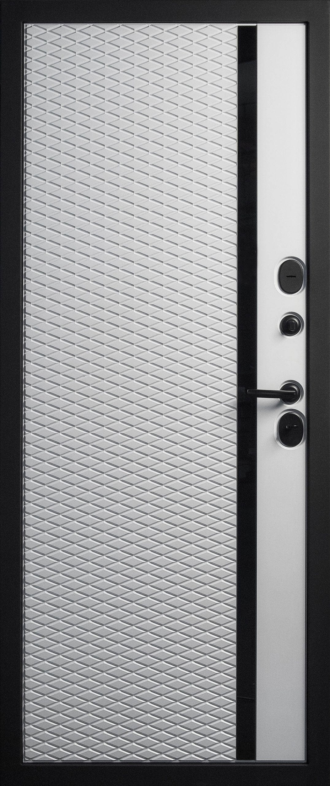 Дверь металлическая входная. Прокатный короб из холоднокатанной стали 1,5 мм. Толщина металла полотна 1,5 мм. Все конструктивные элементы двери изготовлены на лазерной установке с источником IPG. Толщина полотна 106 мм. Наполнение полотна: минеральная вата Tisma Aquastatic/Ursa Geo 44 + базальтовая плита Rockwool/Euroizol. Короб закрытый, также утеплен базальтовой плитой. Основной замок цилиндровый Гардиан 3211 (4 класс защиты по ГОСТ 5089-2011), дополнительный замок сувальдный Гардиан 3001 (3 класс защиты по ГОСТ 5089-2011). Для регулировки притвора двери на коробе установлен эксцентрик. Цилиндровый механизм ключ-шток-вертушок. Накладки овальные. Независимая ночная задвижка. Ручка на квадратном основании основании модель Torr. 3 противосъемных ригеля. 3 контура уплотнения. Уплотнитель изготавливается из резиновых смесей на основе EPDM каучуков. Внутренняя панель фрезерованная МДФ толщиной 10 мм., с вставкой из чёрного стекла, покрытие экошпон, цвет муар чёрный. Внешняя отделка фрезерованная панель МДФ 10 мм., с вставкой из чёрного стекла, покрытие экошпон, цвет муар белый.