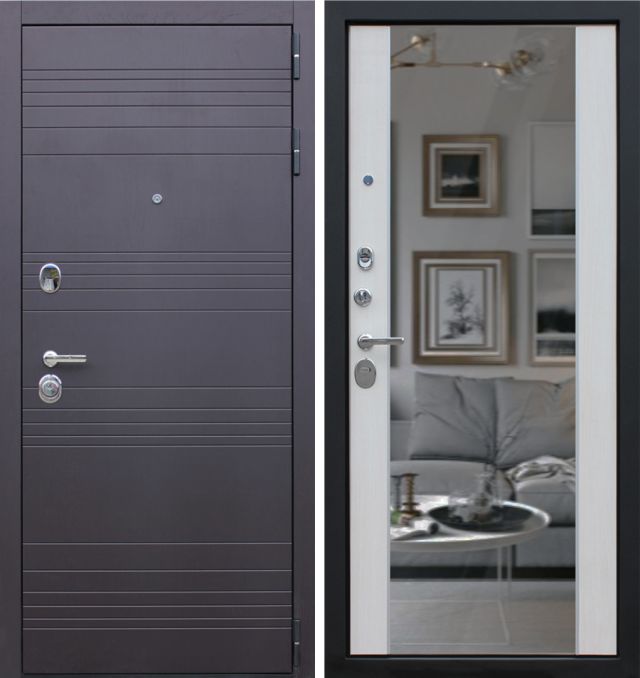 Дверь металлическая входная. Прокатный короб из холоднокатанной стали 1,5 мм. Толщина металла полотна 1,5 мм. Все конструктивные элементы двери изготовлены на лазерной установке с источником IPG. Толщина полотна 106 мм. Наполнение полотна: минеральная вата Tisma Aquastatic/Ursa Geo 44 + базальтовая плита Rockwool/Euroizol. Короб закрытый, также утеплен базальтовой плитой. Основной замок цилиндровый Гардиан 3211 (4 класс защиты по ГОСТ 5089-2011), дополнительный замок сувальдный Гардиан 3001 (3 класс защиты по ГОСТ 5089-2011). Для регулировки притвора двери на коробе установлен эксцентрик. Цилиндровый механизм ключ-шток-вертушок. Накладки овальные. Независимая ночная задвижка. Ручка на круглом основании модель 93. 3 противосъемных ригеля. 3 контура уплотнения. Уплотнитель изготавливается из резиновых смесей на основе EPDM каучуков. Внутренняя панель фрезерованная МДФ толщиной 16 мм., с зеркалом, покрытие экошпон, цвет муар белый. Внешняя отделка фрезерованная панель МДФ 10 мм., покрытие экошпон, цвет шоколад.