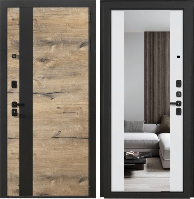 Дверь металлическая входная. Прокатный короб из холоднокатанной стали 1,5 мм. Толщина металла полотна 1,5 мм. Все конструктивные элементы двери изготовлены на лазерной установке с источником IPG. Толщина полотна 106 мм. Наполнение полотна: минеральная вата Tisma Aquastatic/Ursa Geo 44 + базальтовая плита Rockwool/Euroizol. Короб закрытый, также утеплен базальтовой плитой. Основной замок цилиндровый Гардиан 3211 (4 класс защиты по ГОСТ 5089-2011), дополнительный замок сувальдный Гардиан 3001 (3 класс защиты по ГОСТ 5089-2011). Для регулировки притвора двери на коробе установлен эксцентрик. Цилиндровый механизм ключ-шток-вертушок. Накладки квадратные. Независимая ночная задвижка. Ручка на квадратном основании основании модель Torr. 3 противосъемных ригеля. 3 контура уплотнения. Уплотнитель изготавливается из резиновых смесей на основе EPDM каучуков. Внутренняя панель фрезерованная МДФ толщиной 16 мм., с зеркалом, покрытие экошпон, цвет муар белый. Внешняя отделка фрезерованная панель МДФ 10 мм., с вставкой из чёрного стекла, покрытие экошпон, цвет дуб пацифик горизонт.